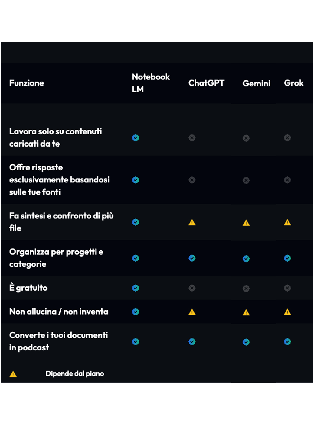 | Funzione | Notebook LM | ChatGPT | Gemini | Grok |